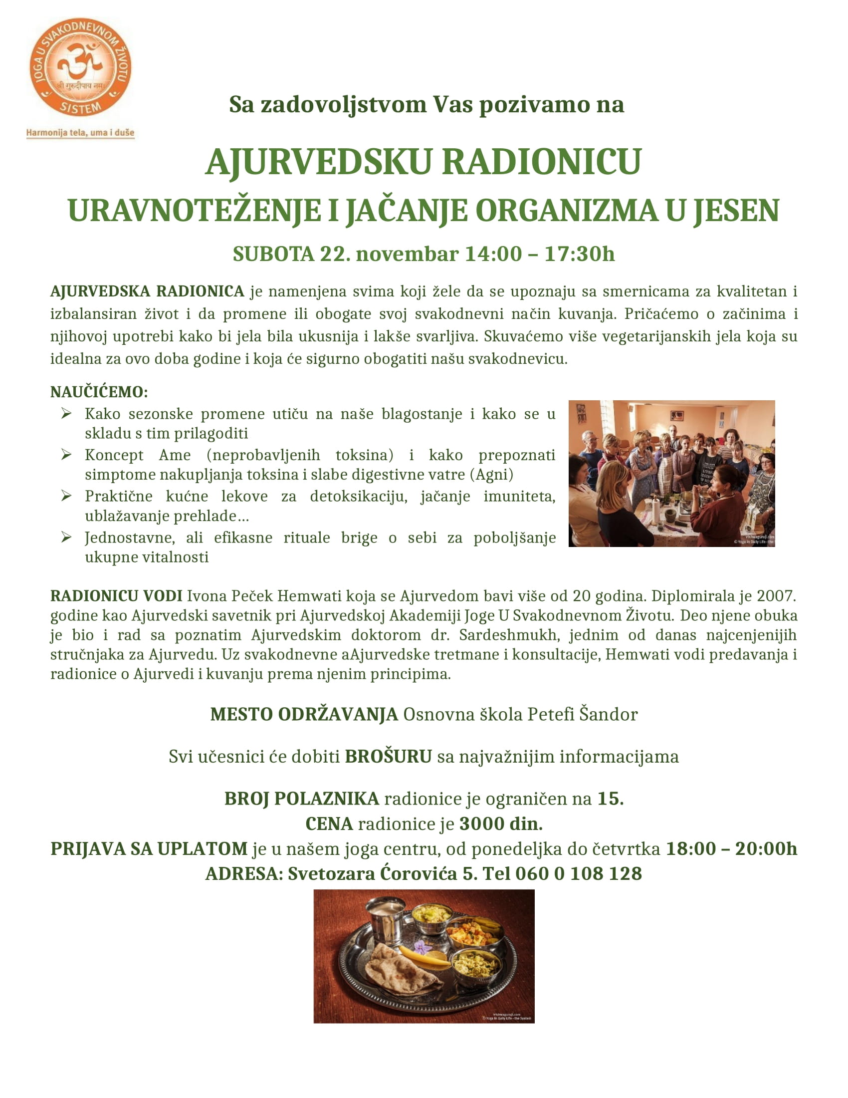 Sa zadovoljstvom Vas pozivamo na DAN AJURVEDE (predavanje i radionica) subota 22. NOVEMBAR