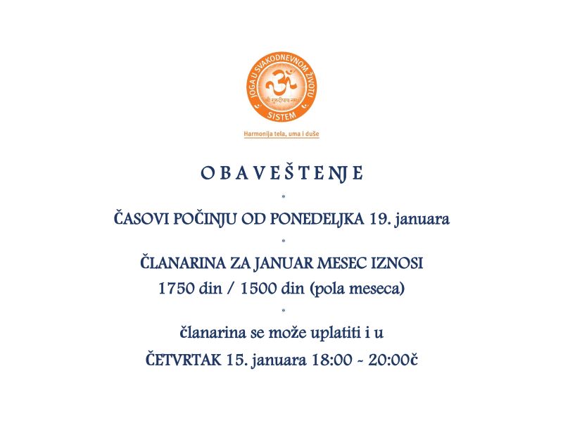 ČLANARINA za januar mesec iznosi 1750 din / 1500 din (pola meseca)
